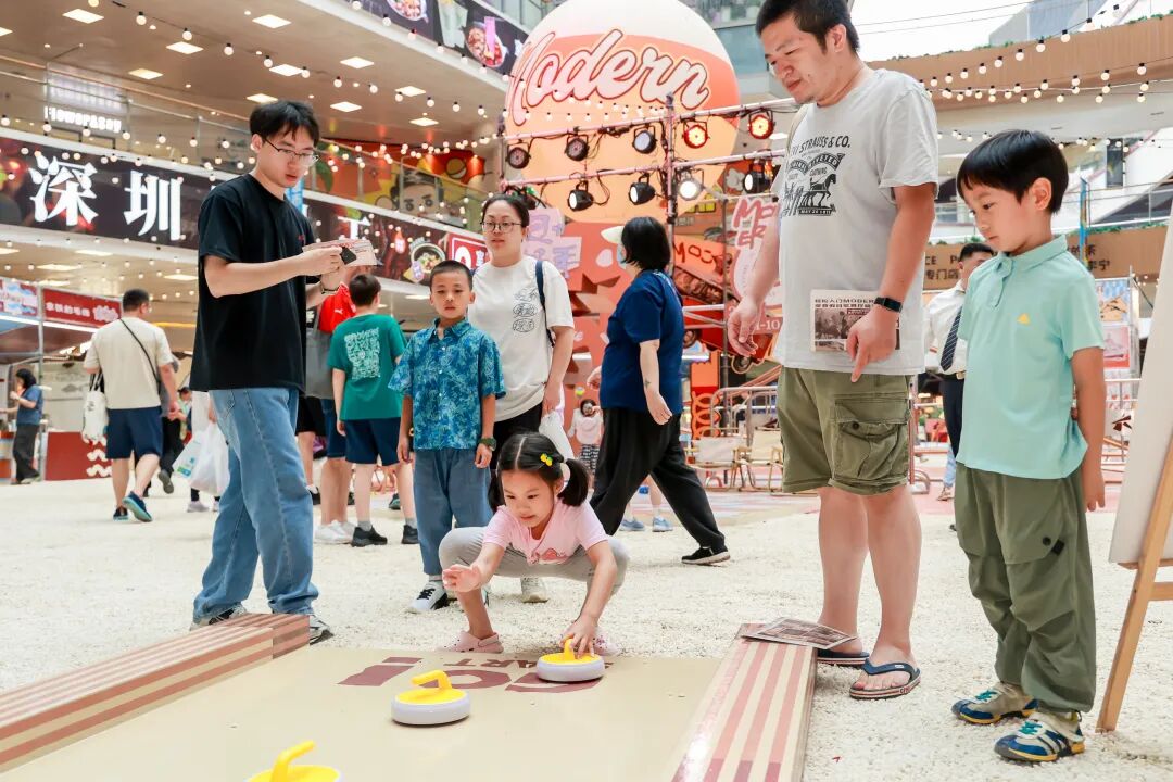 除了视听盛宴,现场更是一片欢乐的互动天地。旱地冰壶、沙包投掷、迷你攀岩等游戏区域排起了长队。一场别开生面的“集章打卡”寻宝之旅,更是激发了游客的参与热情。许多人手持活动地图,穿梭在各个打卡点之间,只为收集完整的印章,兑换“摩登显眼包”和“摩登红人手串”等独家礼品,将这份摩登记忆带回家。