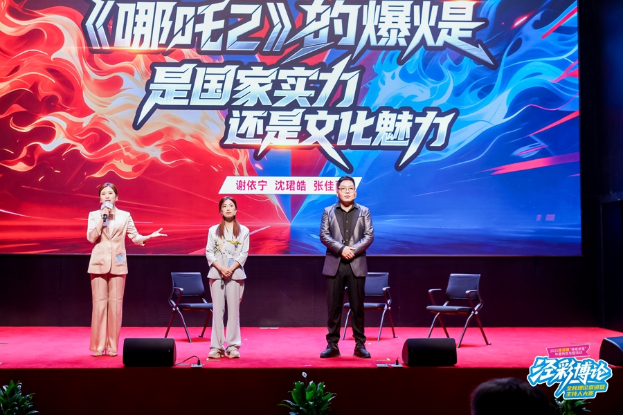 “《哪吒2》让中国文化走上世界巅峰”话题则以一段融合传统与现代的唱跳演绎开场。选手沈珺皓强调:“国家实力是文化走向世界的坚实后盾”,指出技术、产业链与政策推动的关键作用;而张佳丽则聚焦文化本身的感染力,认为“《哪吒2》的魅力,源于中国元素的生动表达”。作为双轨赛制的参与者、主持人赛道第一名获得者谢依宁在赛后分享道:“我们团队对作品反复打磨,融入说唱、霹雳舞等多元形式,让理论宣讲‘活’了起来。这个平台也让我在挑战中不断成长。”